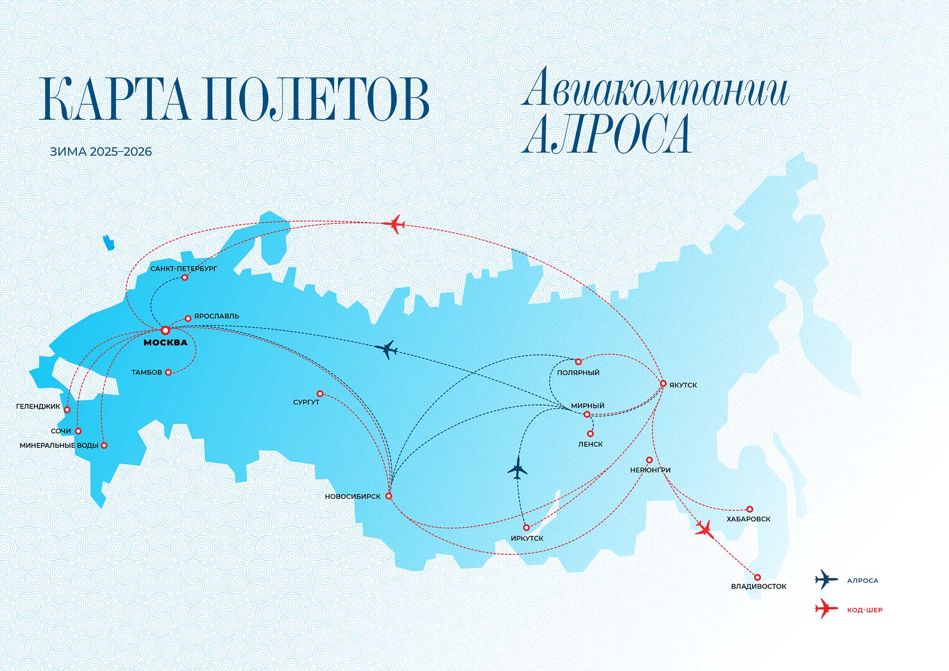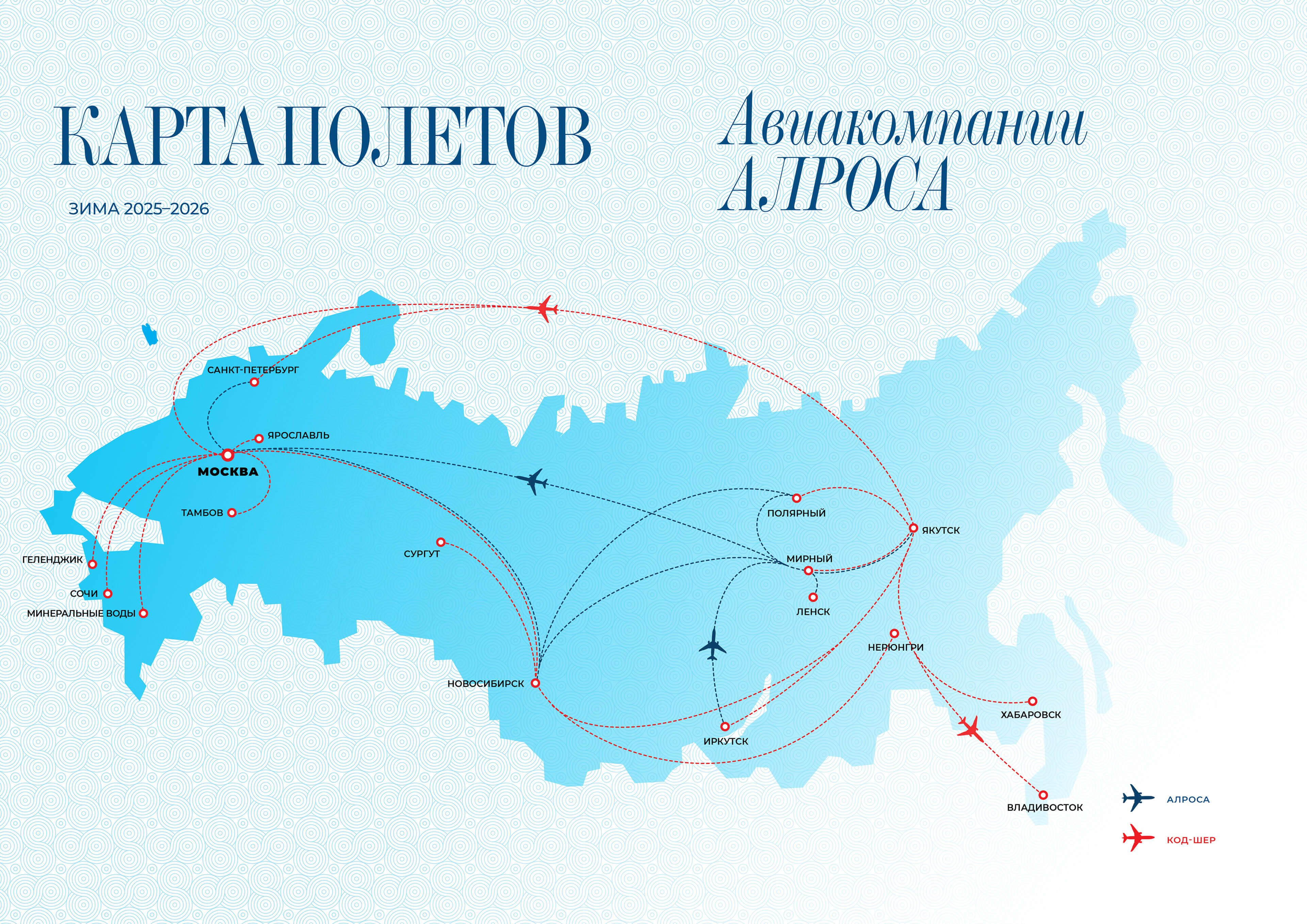 Карта «кликабельна»: при наведении курсором мыши, или пальцем на карту на экране мобильного устройства и нажатии на карту, в новом окне откроется изображение в высоком разрешении. Синим цветом обозначены собственные рейсы (выполняются АО «Авиакомпания АЛРОСА»), красным цветом обозначены рейсы код-шер (выполняются авиакомпаниями-партнёрами).